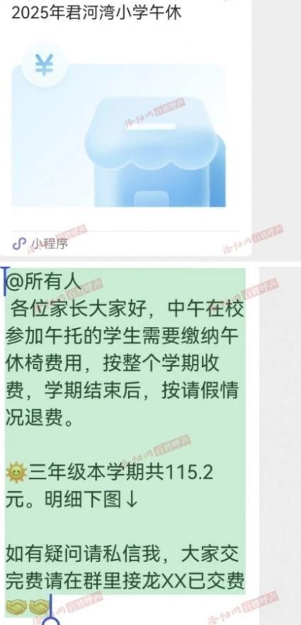 涉事学校是瀍河区君河湾小学,是一所公办小学。对此,11月24日,瀍河区教体局复兴:该校聚合爱心企业推出资本价午休模范,经家委会算计收尾共鸣后,为午托学生成立午休椅,收费按天谈判,期末结算。