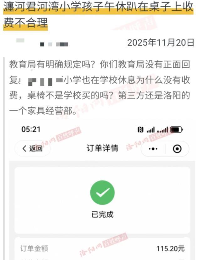 近日,网友反应,洛阳一小学孩子使用学校午休椅要收费,觉得收费永别理。有关截图泄漏,支付用度115元。此前也有网友反应,该校收取午休桌椅费,一学期115元。(据11月26日潇湘晨报报谈)