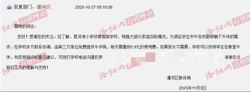 该复兴称,学生摆脱遴荐是否使用躺椅,当今学改革在统计使用情况,完成统计后将第一技巧退费。值得谛视的是,瀍河区教体局此前也复兴过此事:午休椅由第三地契元免费提供,每天需交纳0.9元使用费。