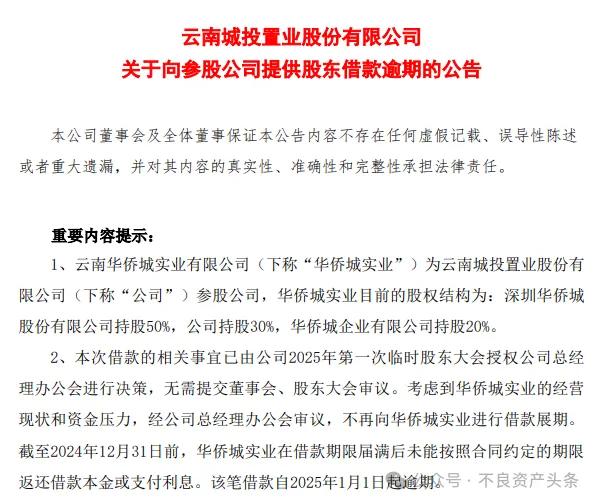 1月3日,云南城投发布公告称,为相沿华裔城实业开展业务和平方运筹帷幄,公司延续向华裔城实业提供借债,末端2020年12月借债本金余额4200.69万元,自2020年至2024年,公司每年对华裔城实业提供的借债进行延期,到期日为2024年12月31日,因濒临强烈的市集竞争和巨大的资金压力,华裔城实业无法如期偿还上述借债及利息,于2025年1月1日起过时。