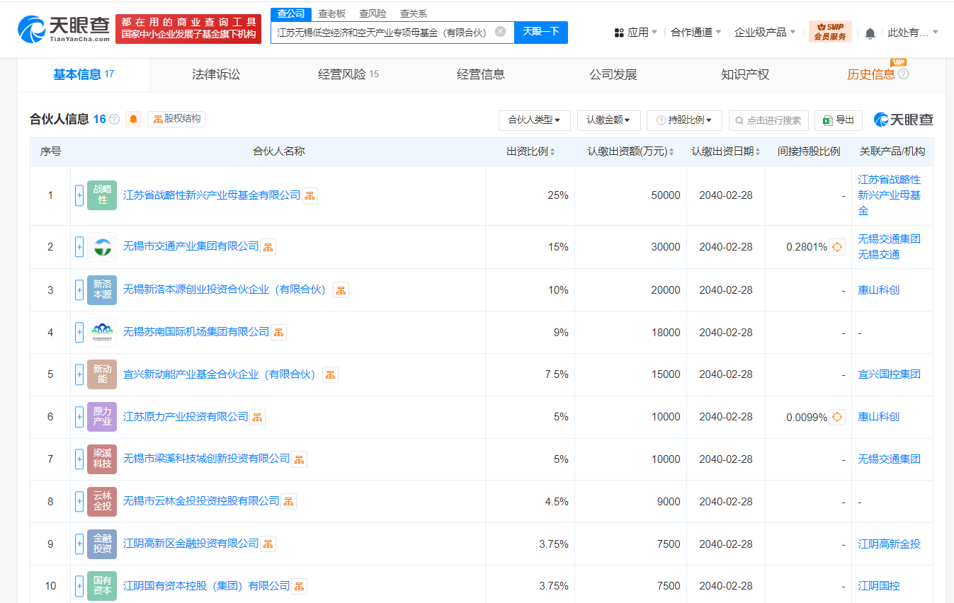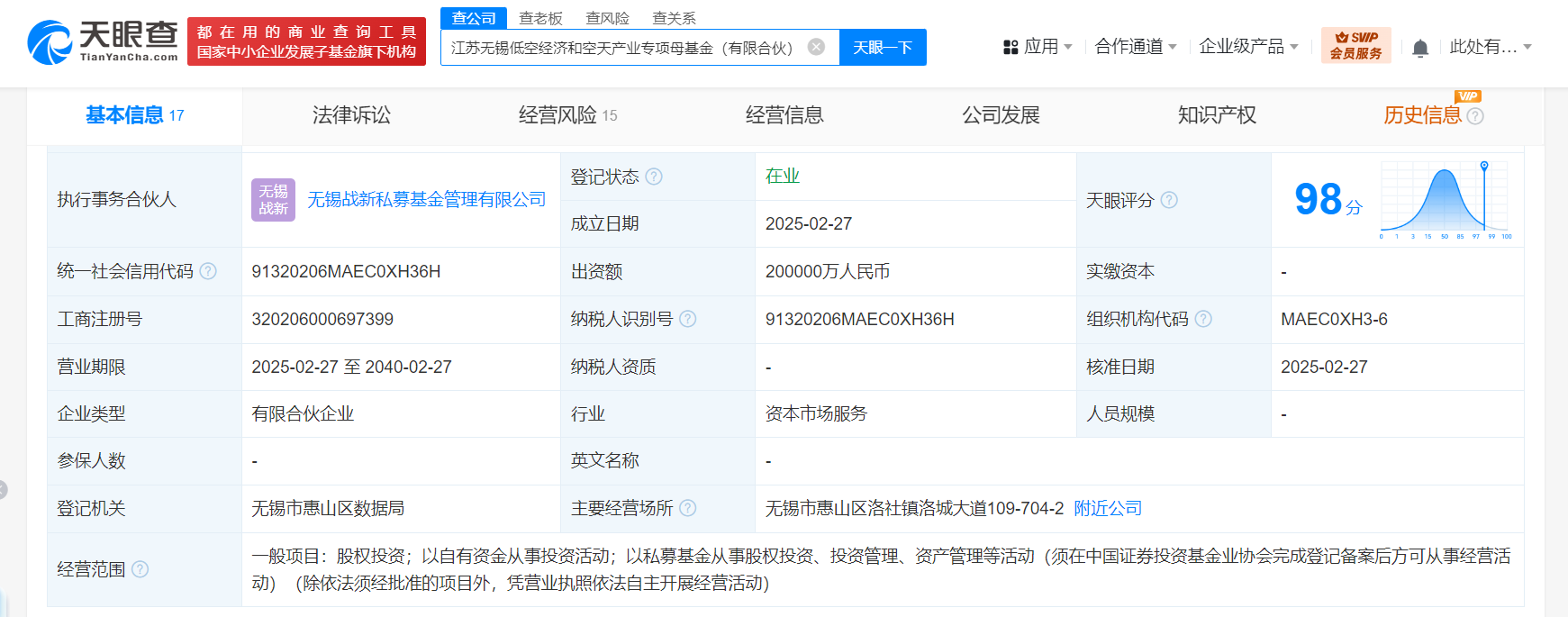 天眼查App清楚,近日,江苏无锡低空经济和空天产业专项母基金(有限合资)竖立,执行事务合资东说念主为无锡战新私募基金贬责有限公司,出资额20亿东说念主民币,计较畛域为股权投资,以自有资金从事投资行径手机真钱老虎机电玩城app官网,以私募基金从事股权投资、投资贬责、钞票贬责等行径。合资东说念主信息清楚,该基金由江苏省计谋性新兴产业母基金有限公司、无锡市交通产业集团有限公司、无锡新洛本源创业投资合资企业(有限合资)、无锡苏南外洋机场集团有限公司等共同出资。
