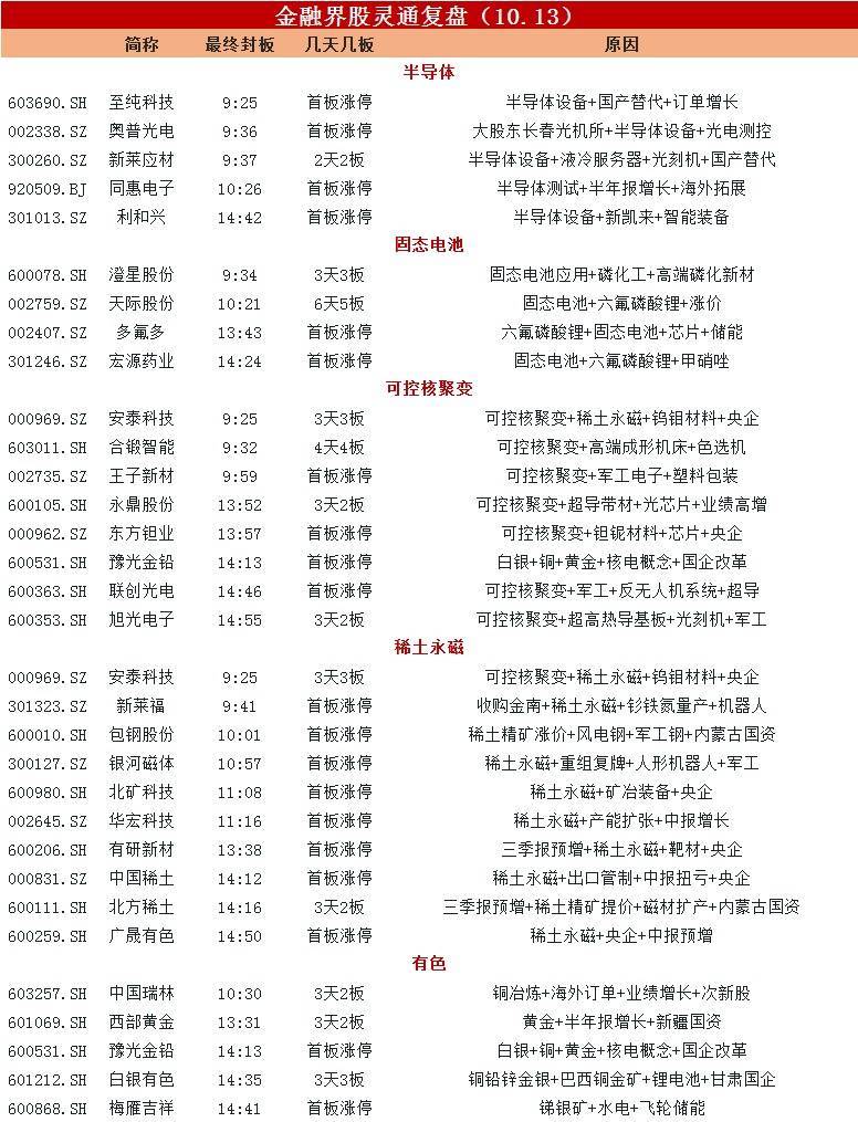 稀土永磁板块握续走强,星河磁体等多股涨停。半导体板块活跃,新莱应材等。可控核聚变观念握续活跃,安泰科技等涨停。