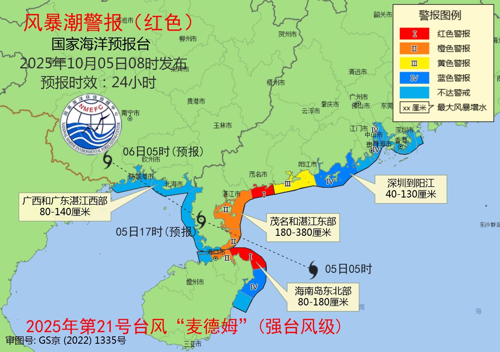 国度海洋预告台凭据《海洋灾害救急预案》发布风暴潮红色警报。受本年第21号台风“麦德姆”(强台风级)的影响,瞻望:10月5日上昼至6日上昼,广东深圳到阳江沿海将出现40到130厘米的风暴增水,广东茂名和湛江东部沿海将出现180到380厘米的风暴增水,海南岛东北部沿海将出现80到180厘米的风暴增水,广西和广东湛江西部沿海将出现80到140厘米的风暴增水。广东省茂名市和海南省文昌市的风暴潮预警级别为红色,广东省湛江市和海南省海口市的风暴潮预警级别为橙色,广东省阳江市的风暴潮预警级别为黄色,广东省广州市的风暴潮预警级别为蓝色。