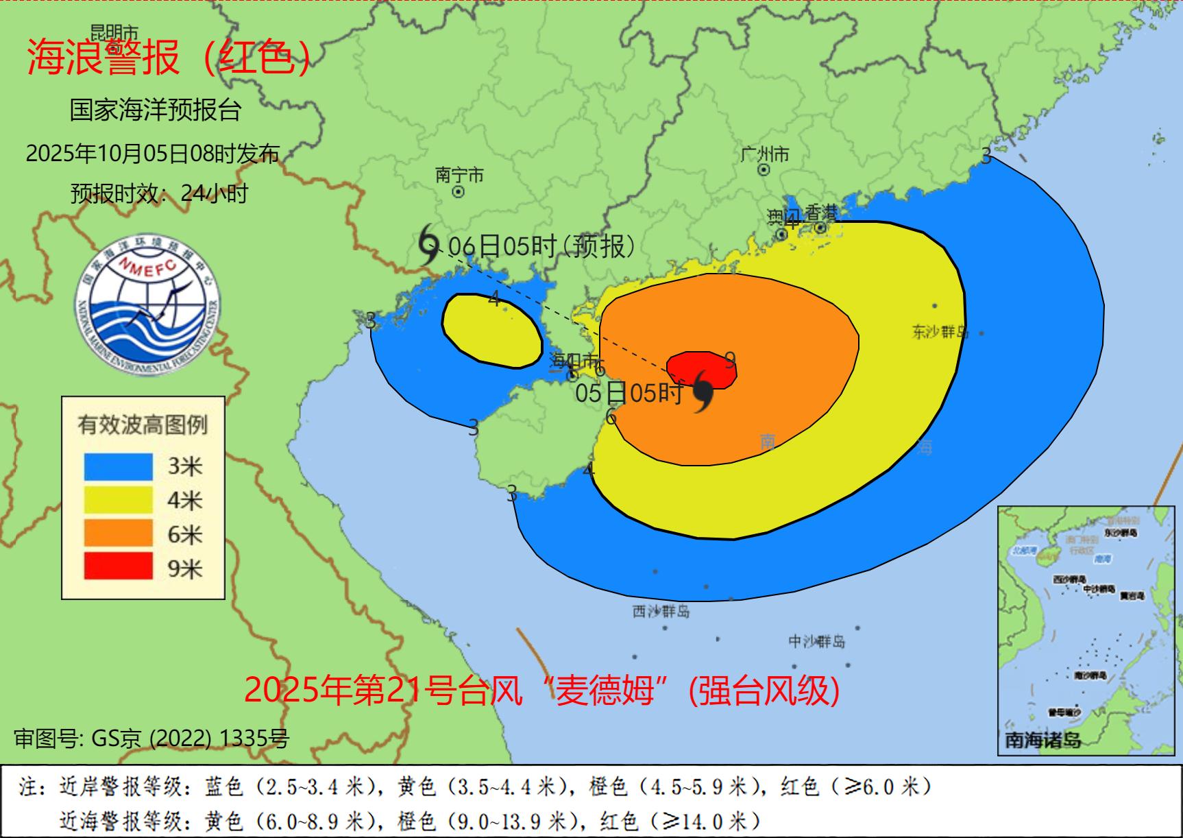 国度海洋预告台凭据《海洋灾害救急预案》发布波浪红色警报。受本年第21号台风“麦德姆”(强台风级)的影响,瞻望:10月5日上昼到6日上昼,南海西北部将出现6到10米的狂浪到狂涛区,北部湾将出现3到5米的大浪到巨浪区,近海海域波浪预警级别为橙色;广东西部、海南东北部近岸海域将出现4到6米的巨浪到狂浪,该近岸海域波浪预警级别为红色,广东东部、海南东南部、西北部、广西近岸海域将出现2.5到4米的大浪到巨浪,该近岸海域波浪预警级别为黄色。请在上述海域功课的船只刺目安全,沿海各相关单元提前接纳防浪避浪纪律。